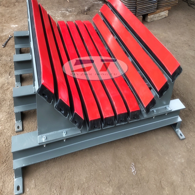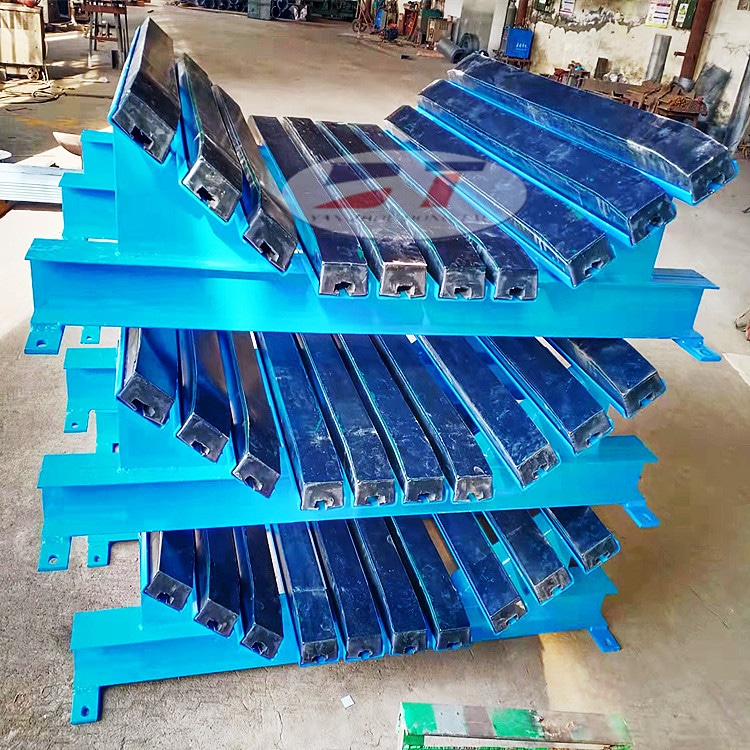 緩沖床的優(yōu)勢(shì):緩沖床有耐磨損和抗沖擊的能力,可靠性高為輸送機(jī)皮帶提供全面支撐,保證落料區(qū)緩沖床與輸送皮帶之間的面與面接觸,緩沖床與導(dǎo)料槽密封裙邊使用的完美結(jié)合。能達(dá)到更好的密封除塵效果。緩沖托輥長(zhǎng)時(shí)間運(yùn)行表面易粘附物料,磨損皮帶,嚴(yán)重者會(huì)引起皮帶跑偏,支承托輥轉(zhuǎn)動(dòng)軸承長(zhǎng)期受到?jīng)_擊,軸承和密封容易失效,造成托體轉(zhuǎn)動(dòng)不靈活或不轉(zhuǎn)動(dòng),磨損皮帶表面。在傳統(tǒng)的輸送系統(tǒng)中,輸送帶與托輥的摩擦及受力不均問題,更加容易造成皮帶跑偏問題,尤其在品質(zhì)較差的緩沖托輥上面的橡膠其摩擦系數(shù)更大,容易造成皮帶嚴(yán)重跑偏,而緩沖床的“順力設(shè)計(jì)”加上其耐磨層采取超高分子量聚乙烯板這種低摩擦系數(shù)的材料,一方面大大降低了與輸送帶摩擦而造成的皮帶跑偏,另一方面保護(hù)了降低了與輸送帶的磨耗,延長(zhǎng)其使用壽命。因此緩沖床是物料轉(zhuǎn)載點(diǎn)的支承緩沖結(jié)構(gòu),由于保證了輸送帶的面與面的接觸,受力均勻,有效防止了由于托輥斷裂、脫落造成的皮帶縱向撕裂,同時(shí)大大降低了皮帶被鐵器或尖銳物料穿透后導(dǎo)致輸送帶的撕裂的概率,而緩沖床核心部件緩沖條自身高彈性橡膠緩沖,使得能夠很好的避免這種問題發(fā)生。