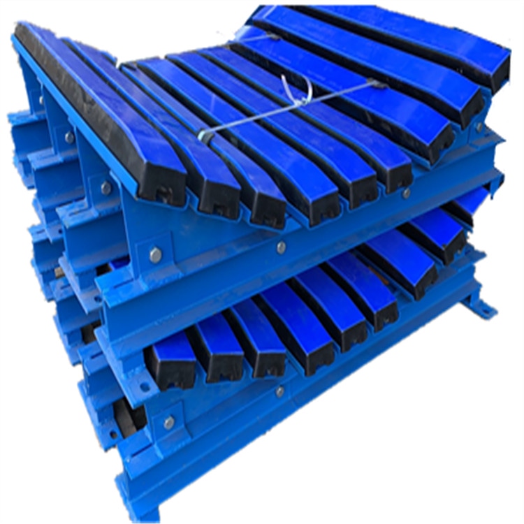 4、緩沖條的表面材料為UHMW-PE,表面光滑且耐磨,可減少摩擦阻力,延長使用壽命。橡膠可有效吸收物料對皮帶的沖擊力。