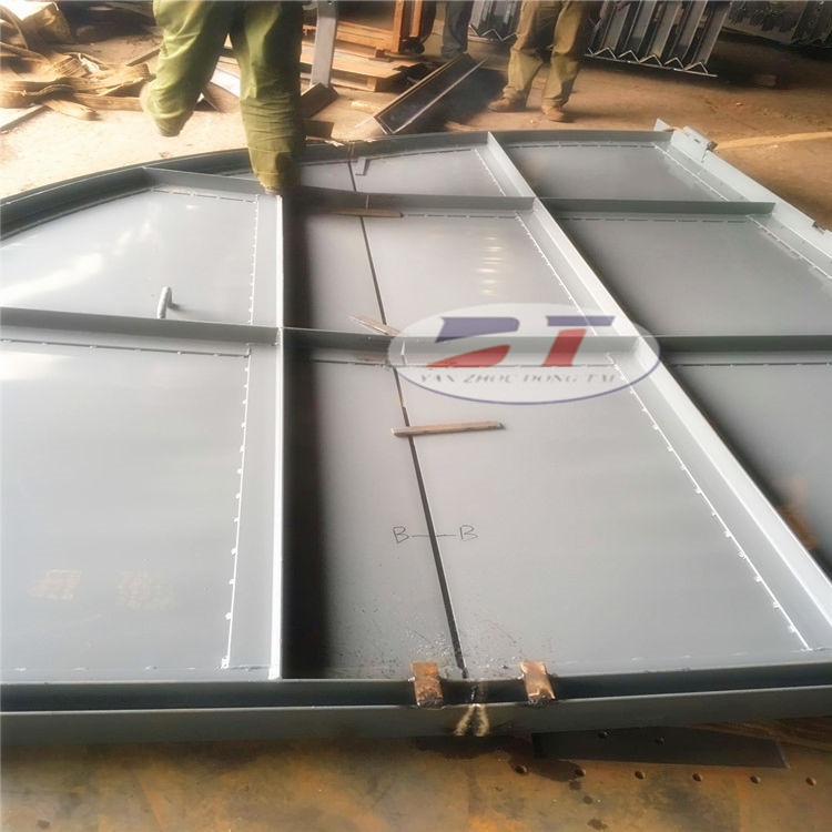 斜風井防爆門是安裝在裝有主要通風機的排風井口上的特殊密封井蓋。在正常通風時,它被用來隔離井下氣流與地面大氣,防止風流短路,保證通風系統(tǒng)正常。當井下一旦發(fā)生瓦斯或煤塵爆炸事故時,防爆門被爆炸的氣流沖擊打開,從而爆炸氣流直接排放到地面大氣,起到卸壓作用,防止主要通風機因爆炸氣流沖擊而造成損壞;當主要通風機停止運行時,可以打開防爆門,以利用自然風壓通風。