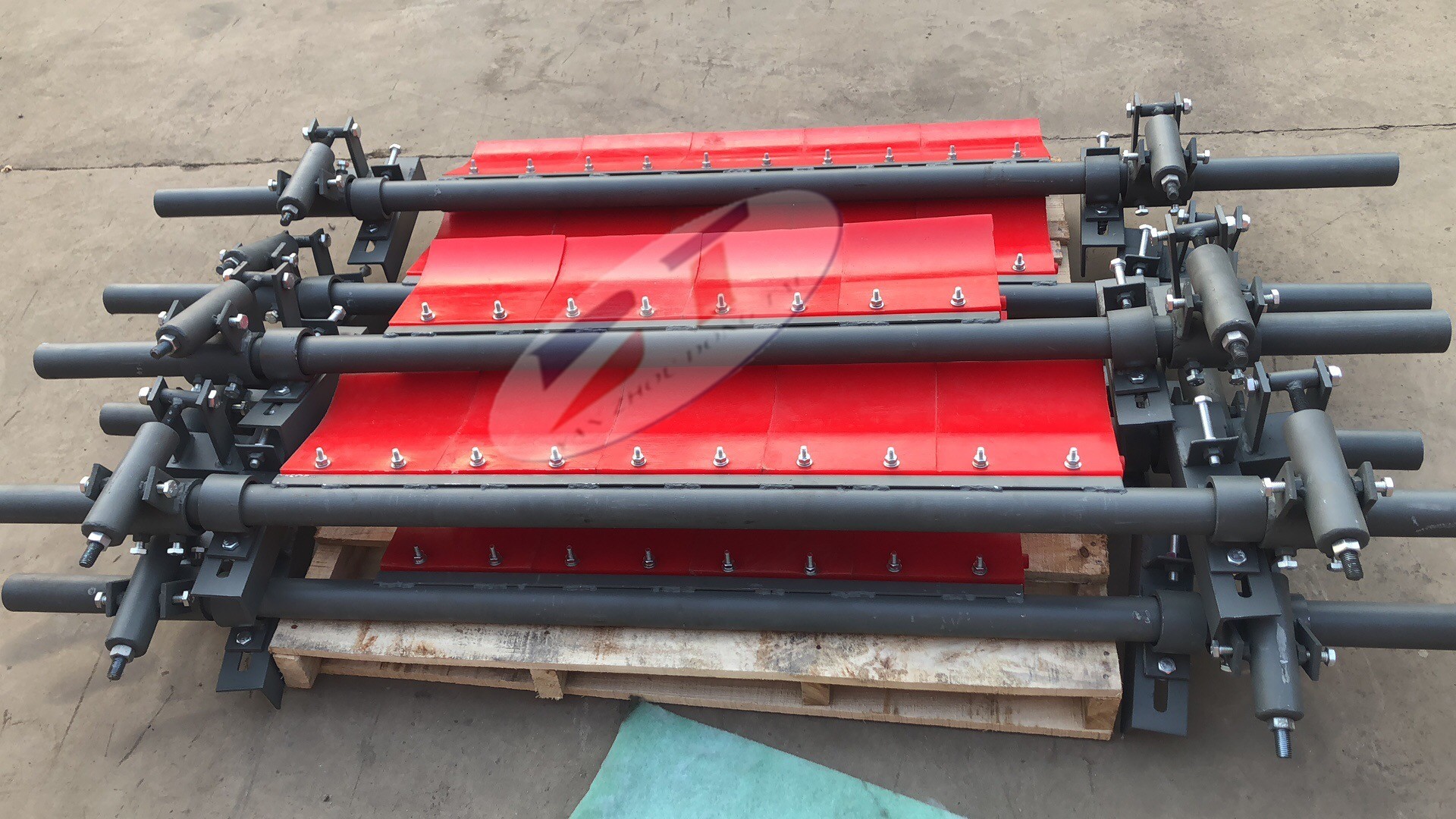 清掃器在輸送機(jī)上有著不可忽視的作用。在運(yùn)行中,如果人為的清除機(jī)尾滾筒附著物,往往容易發(fā)生嚴(yán)重人身傷亡事故。而清掃器有及時(shí)、方便地、快速的清除滾筒附著物的特點(diǎn)。