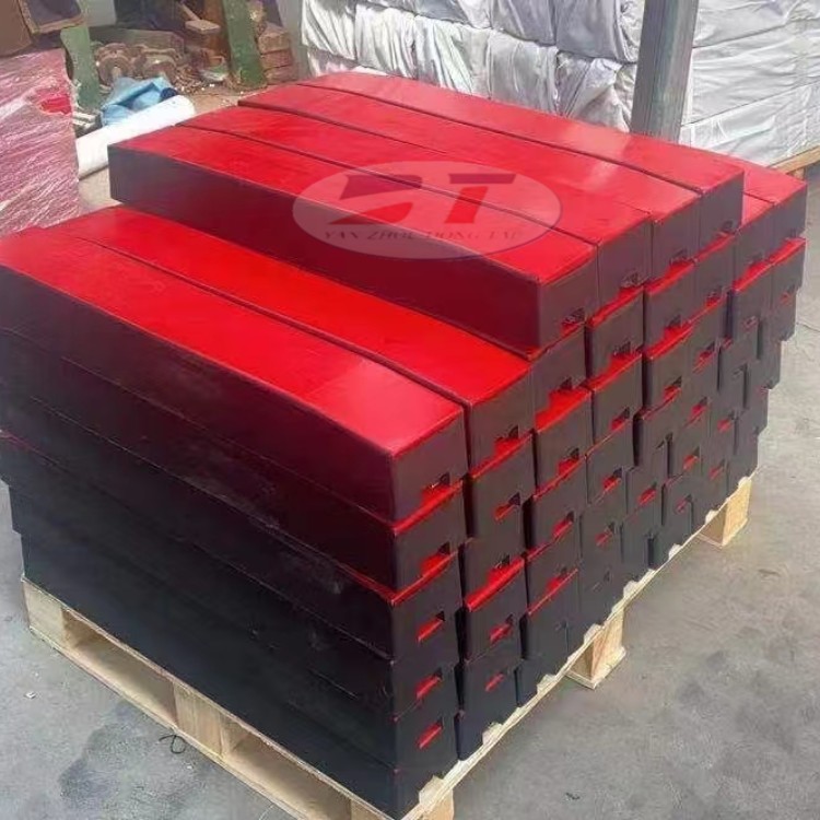 緩沖條耐磨層采用UHMW高分子聚乙烯板材,分子含量高,高于500萬(wàn)分子量,自潤(rùn)滑性能好,摩擦系數(shù)小,磨損率低一般不大于0.3,耐磨性能好,使用壽命長(zhǎng)。