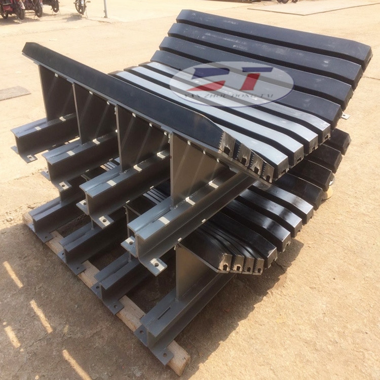 4、緩沖條的表面材料為UHMW-PE,表面光滑且耐磨,可減少摩擦阻力,延長使用壽命。橡膠可有效吸收物料對皮帶的沖擊力。