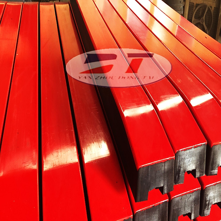 緩沖條耐磨層采用UHMW高分子聚乙烯板材,分子含量高,高于500萬分子量,自潤滑性能好,摩擦系數(shù)小,磨損率低一般不大于0.3,耐磨性能好,使用壽命長。