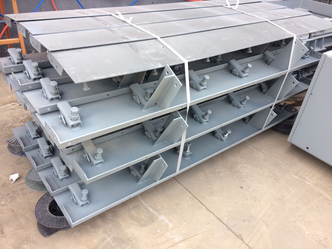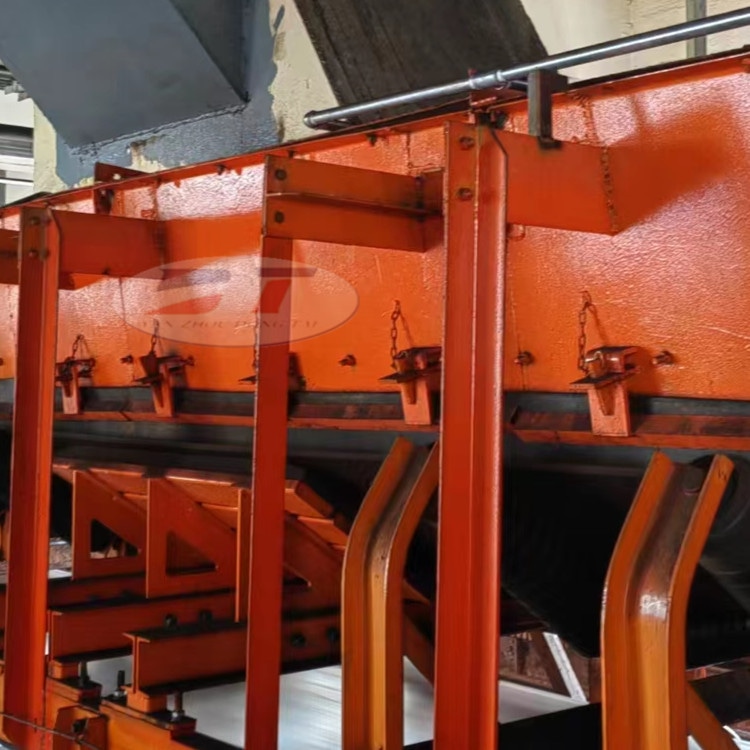 導料槽可分為DTII型和全封閉型;如果是全密封型,由上中下三部分組成,中間側(cè)板與輸送機機架連接,為固定部分,上頂蓋及下底板分別同側(cè)板通過螺栓連接,可很方便的進行拆卸,以便安裝和維修。兗州東泰導料槽的前后端裝有多道密封擋板和擋簾組成均壓封塵降塵系統(tǒng),使粉塵得到降壓、減速、沉降,使較干凈氣流在導料槽出口流出。整個導料槽形成封閉式結(jié)構(gòu),當風塵渦流對導料槽形成沖擊風壓時,粉塵不會四溢擴散。