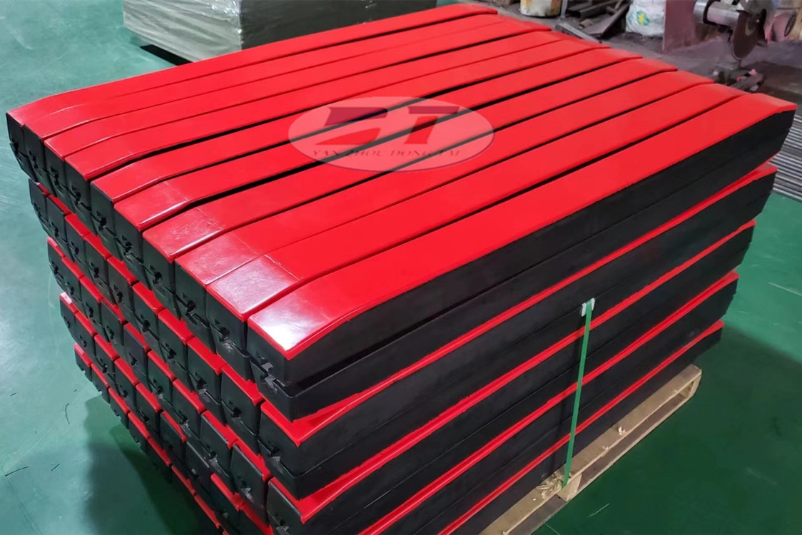 緩沖床主要用于替代緩沖托輥,緩沖床由緩沖條組成,而緩沖條主要應用優(yōu)良的高彈性橡膠層充分有效吸收了物料下落時的沖擊力,大大降低了物料下落時對輸送帶的沖擊,真正的了落料點的受力狀況。