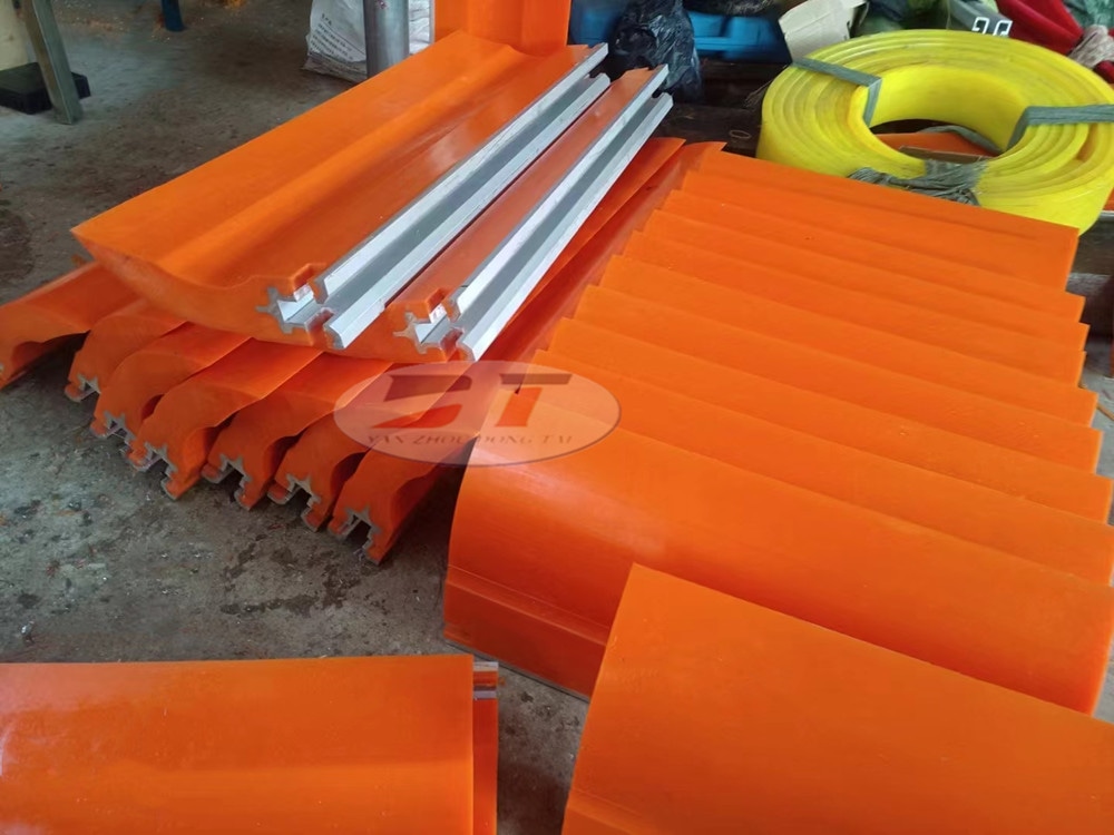 刮刀采用聚氨酯復(fù)合材料,利用模具一體加硫成形,刮刀面平整,直線度好,低摩擦、高耐磨、高強(qiáng)度,具有穩(wěn)定的刮料效果。可有效清除殘留皮帶上之細(xì)粒、濕粘物料。預(yù)壓式調(diào)壓器確保刮刀與皮帶的穩(wěn)定接觸壓力。刮刀面由多塊窄幅聚氨脂刮板組成,具有空形緩沖孔,對(duì)各種皮帶都有良好跟隨性。